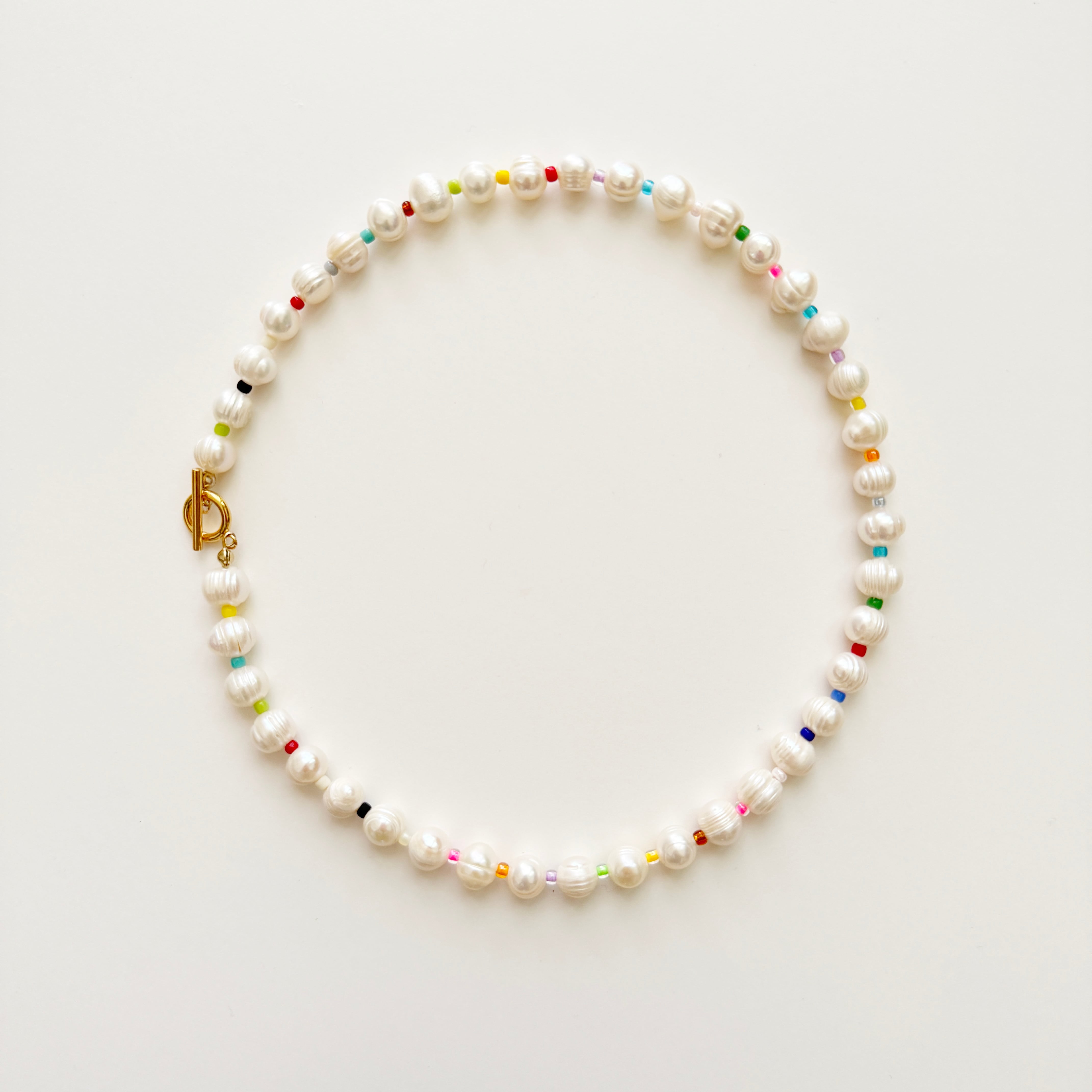 淡水バロックパールとマルチカラーのビーズネックレス。