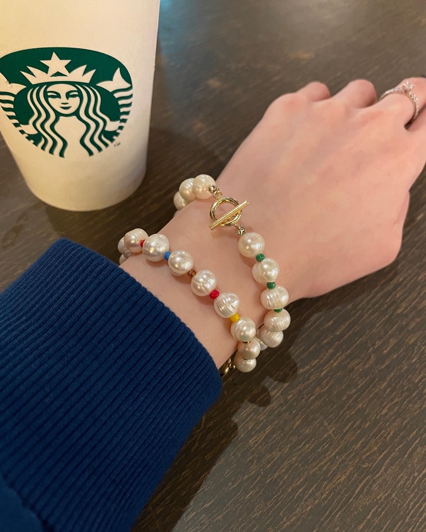 一粒ずつ表情の違う淡水パールとマルチカラーのビーズを組み合わせたブレスレット。夏にぴったりのカラフルなデザインです。