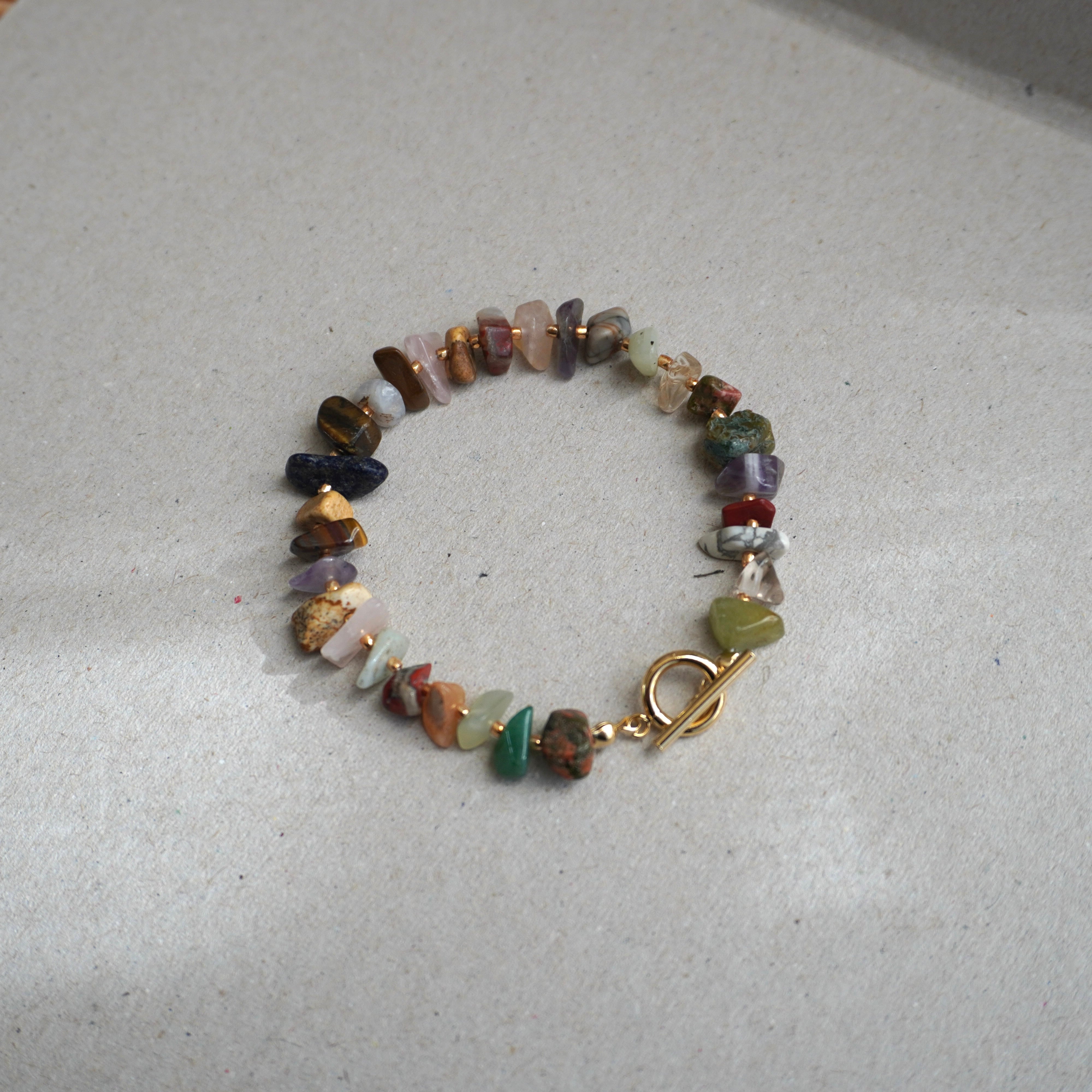 異なる種類の種類の天然石をミックスしたブレスレット。水晶、翡翠、モリオン、タイガーアイ、アクアマリン、アメジスト、ラリマー、ガーネット、ルビー、カーネリアン、シトリン、ラピスラズリ、サファイア、オニキス、