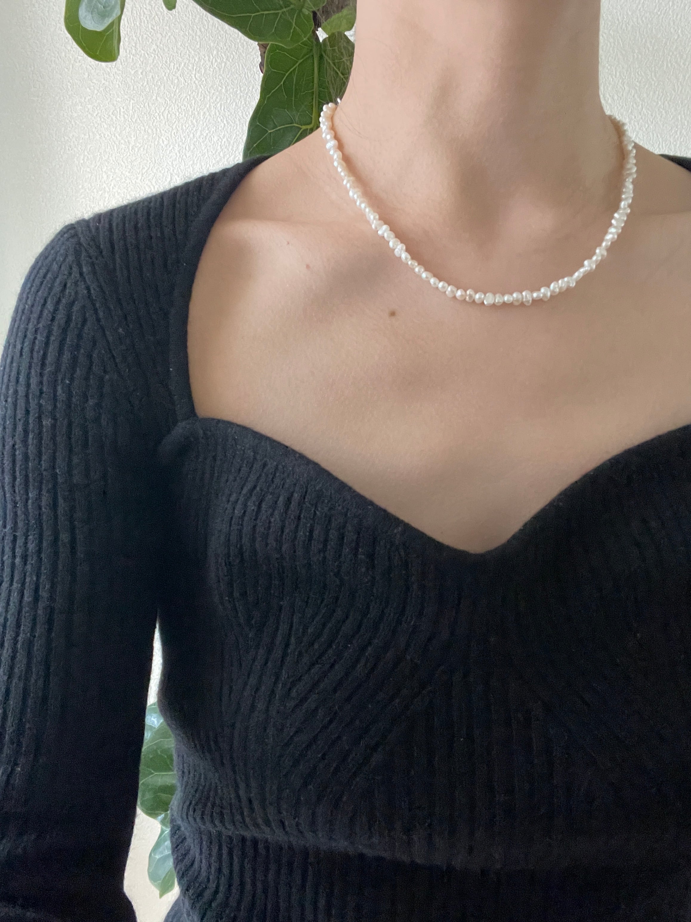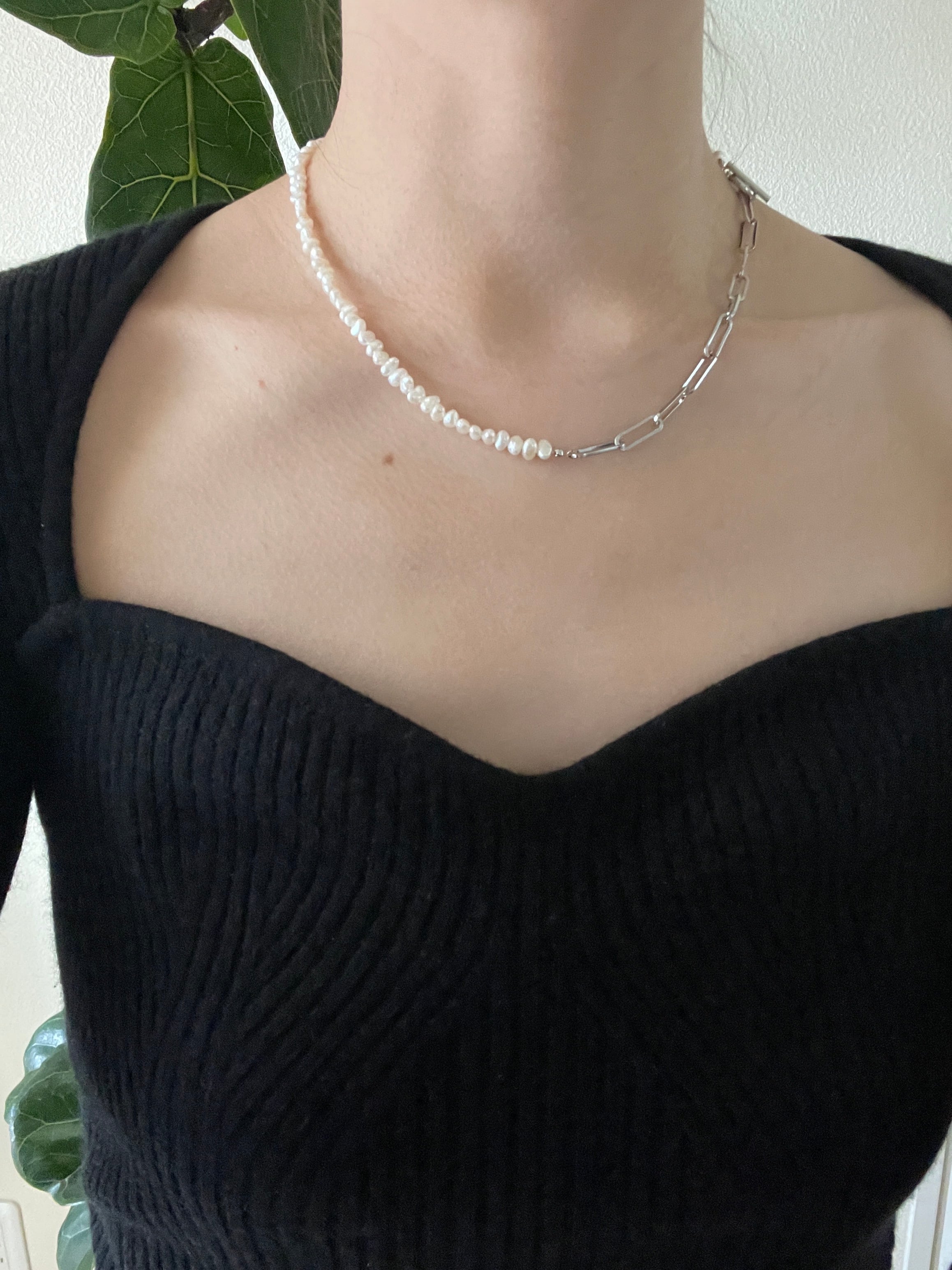 一粒ずつ表情の違う淡水パールを組み合わせたアジャスターつきネックレス。