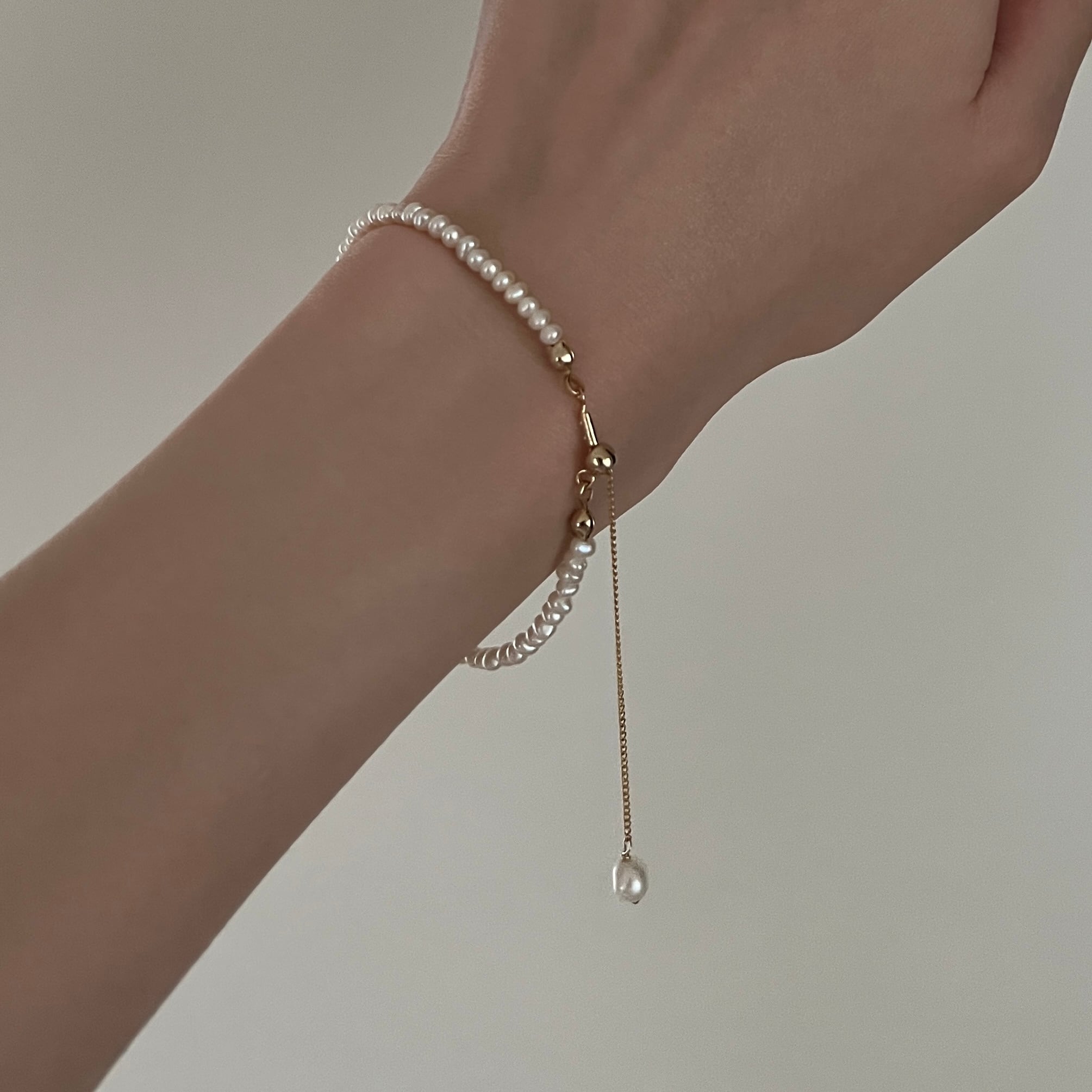 アジャスター付きで、自分でも簡単に装着できるブレスレット。小粒のパールが可憐な印象を演出してくれます。