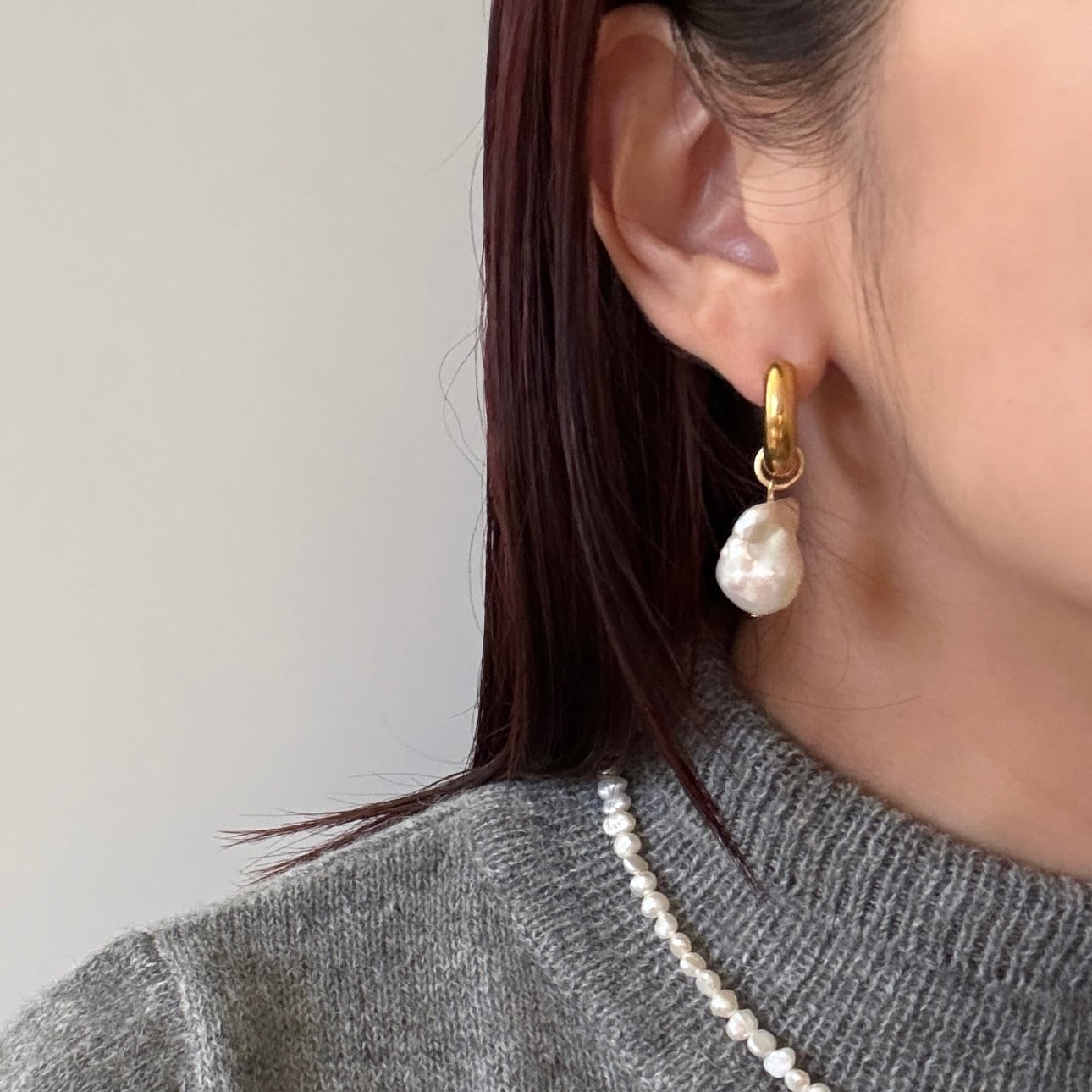 上品なバロックパールがフープ型のイヤリングに施されており、どんなシーンにもマッチするエレガントなデザインです。