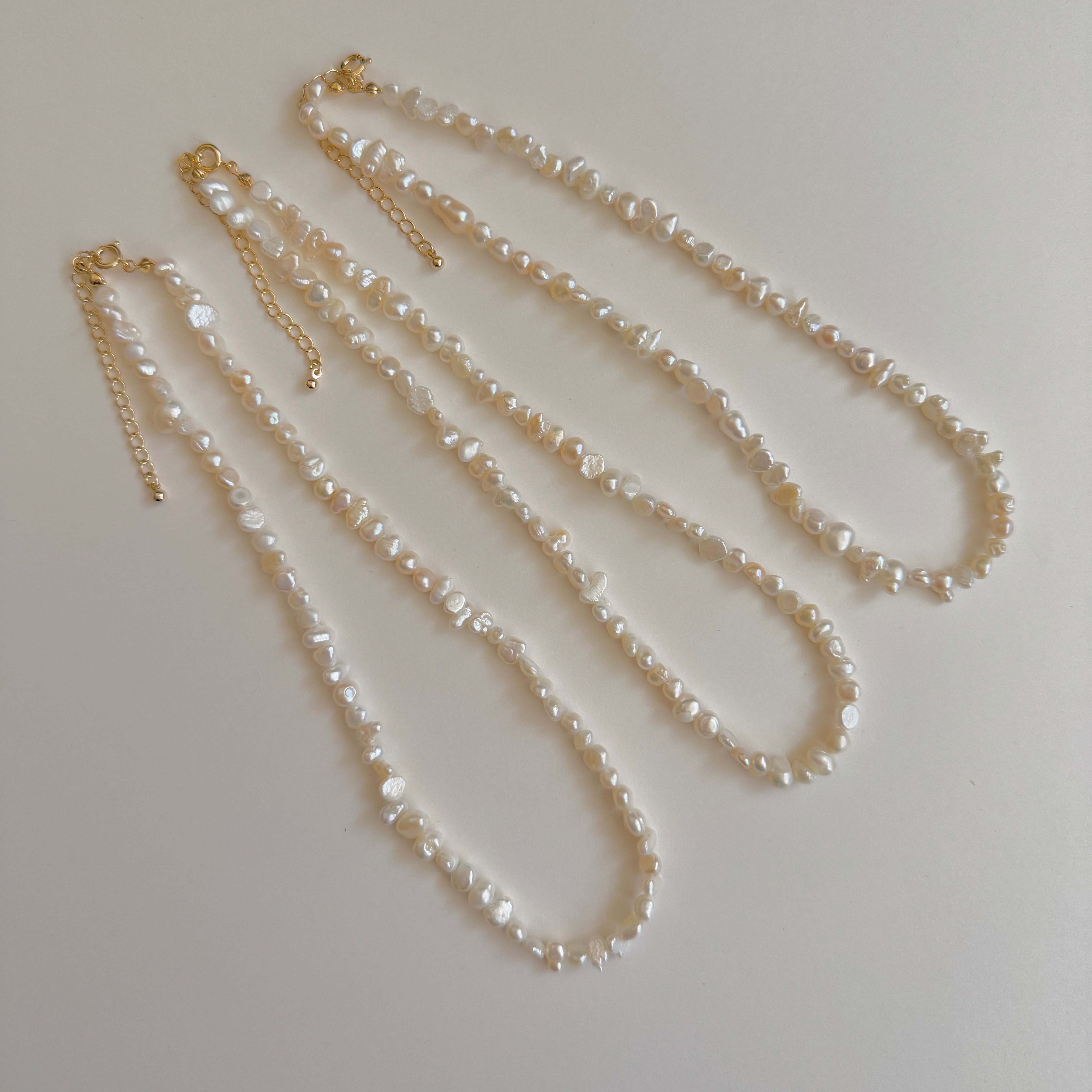 ステイシーで1番人気の高いネックレスの長さやデザインのベースはそのままに、いびつな形のパールを集めて組み合わせたネックレスです。